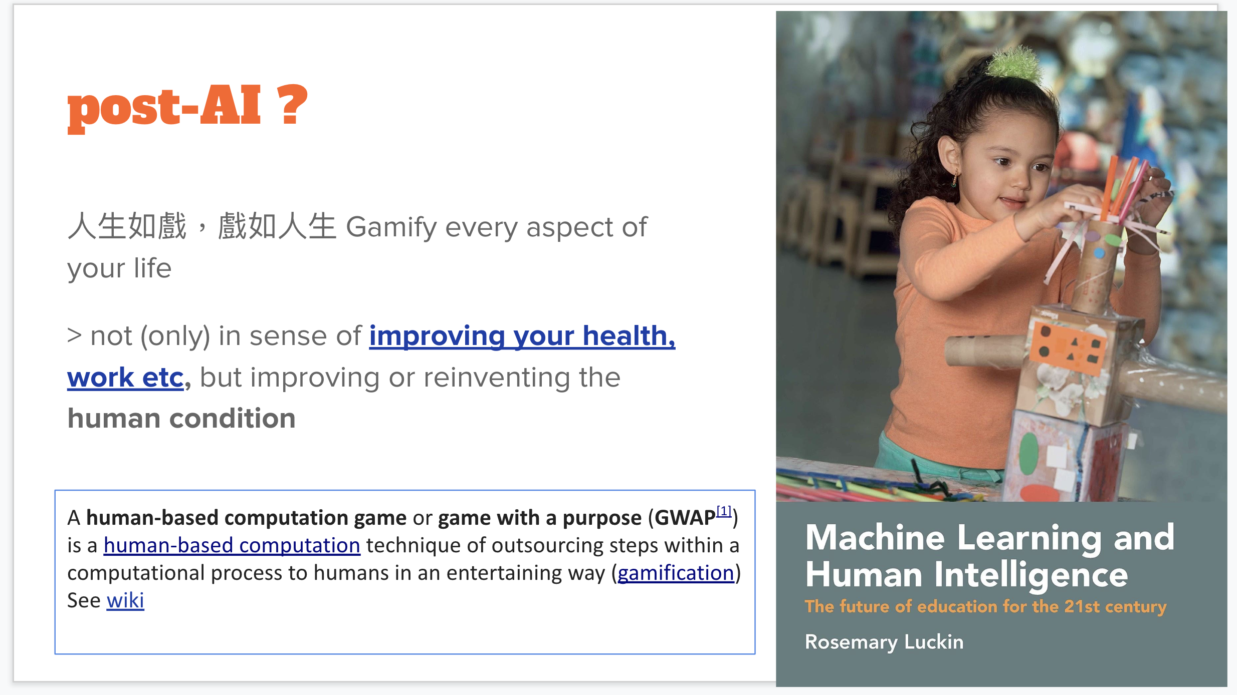 semantris隨著 AR/VR 技術的快速發展,加上與 AI/IOT 的結合,可以想像一個有趣的人類意識的轉化。虛實難分的景況,人生如戲,戲如人生。遊戲產生了新的哲學高度。而遊戲所產生的人類反應資料,也成了機器學習的材料。以 Google 公開的「語意經驗」字詞聯想遊戲